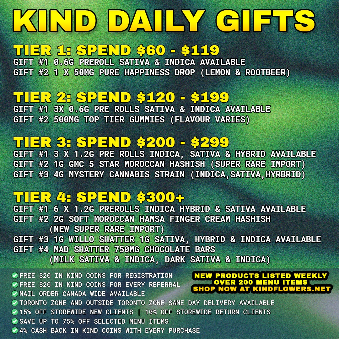 Clients can earn KIND COINS by ordering through our online weed store, registration, referrals, birthdays, & making reviews on our website.